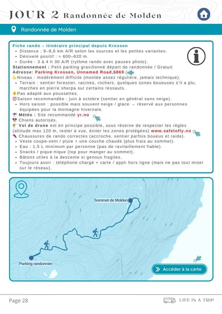 On vous partage notre expérience de voyage et les meilleurs endroits à explorer pour que votre road trip soit une totale réussite. Notre vie en van, nous permet de créer des itinéraires qui prennent en compte toutes les problématiques d’un voyage en camping-car, comme le stationnement, l’autonomie, et surtout l’envie de liberté qu’il procure. Ce carnet de voyage numérique va devenir votre meilleur compagnon de route et vous apportera toutes les informations nécessaires au bon déroulement de votre périple en Norvège !